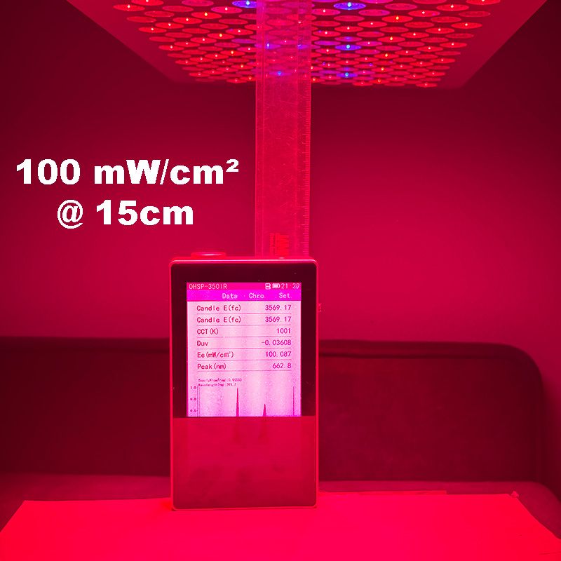 As can be seen from the screenshot below our devices typically provide a peak output of around 100 mW/cm2 at the very centre at 15cm (on 100% settings), but for treatment calculations it is better to estimate an overall output of around 80 mW/cm2 for the larger panels (and perhaps 60 mW/cm2 on smaller panels). Whilst this sounds at first a little inaccurate, once you have worked with a spectrometer you can see how much outputs vary at different points on light emitting devices.
